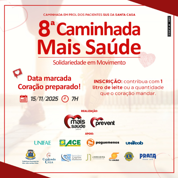 A 8ª Caminhada Mais Saúde, organizada pela Associação Mais Saúde, será realizada no dia 15 de novembro, a partir das 7h, em São João da Boa Vista. Aberta a toda população, a ação solidária tem como objetivo principal arrecadar litros de leite para beneficiar pacientes internados na Santa Casa de Misericórdia Dona Carolina Malheiros, através do Sistema Único de Saúde (SUS).