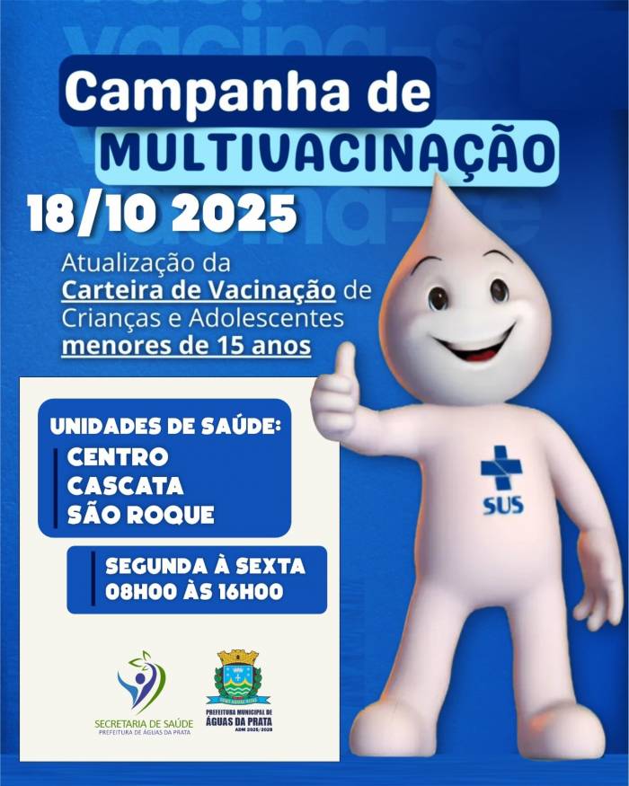 A Prefeitura Municipal de Águas da Prata, por meio da Secretaria de Saúde, promove no próximo dia 18 de outubro de 2025 a Campanha de Multivacinação, destinada à atualização da Carteira de Vacinação de crianças e adolescentes menores de 15 anos.
