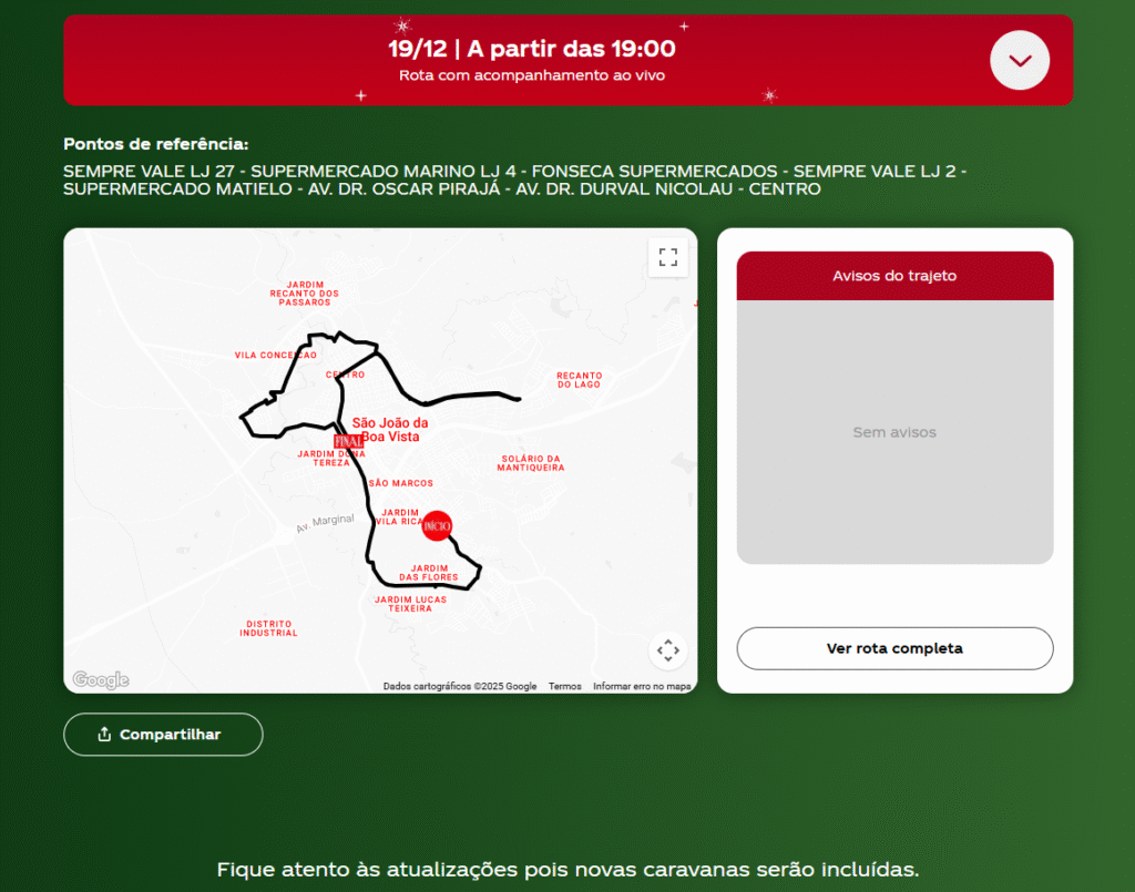 A rota completa da Caravana da Coca-Cola em São João da Boa Vista será divulgada em breve no site oficial e nas redes sociais da marca, o que aumenta ainda mais a expectativa do público. Para acompanhar as atualizações, basta acessar o portal oficial: natal.coca-cola.com.br.