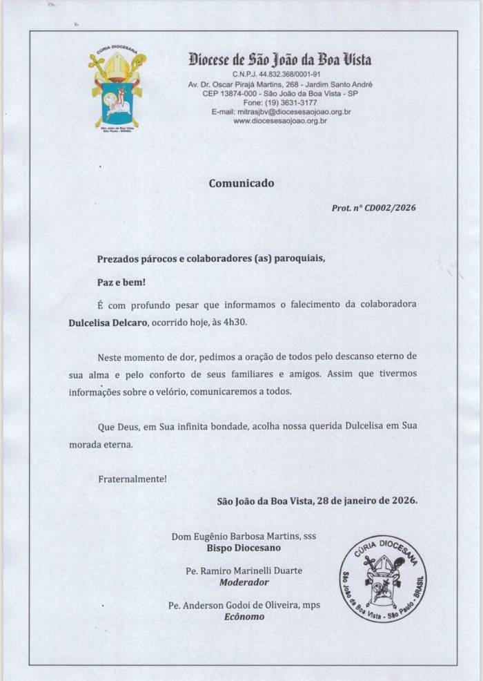 A Diocese de São João da Boa Vista manifestou profundo pesar pelo falecimento de Dulceliza Delcaro, destacando sua contribuição e o carinho com que exercia suas funções.