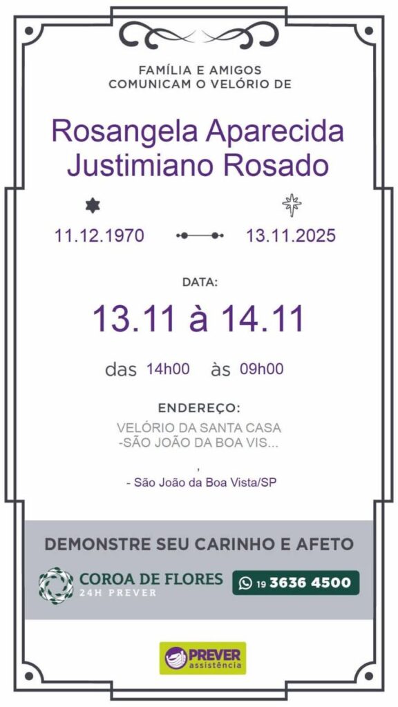 É com grande pesar que comunicamos o falecimento de Rosangela Aparecida Justimiano Rosado, aos 54 anos, ocorrido no dia 13 de novembro de 2025. Residia em São João da Boa Vista, onde era muito querida por familiares e amigos. Deixa o marido, quatro filhas e netos, que lamentam profundamente sua partida.