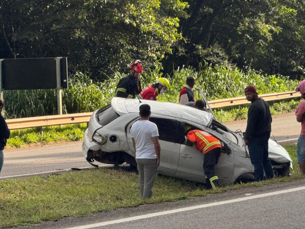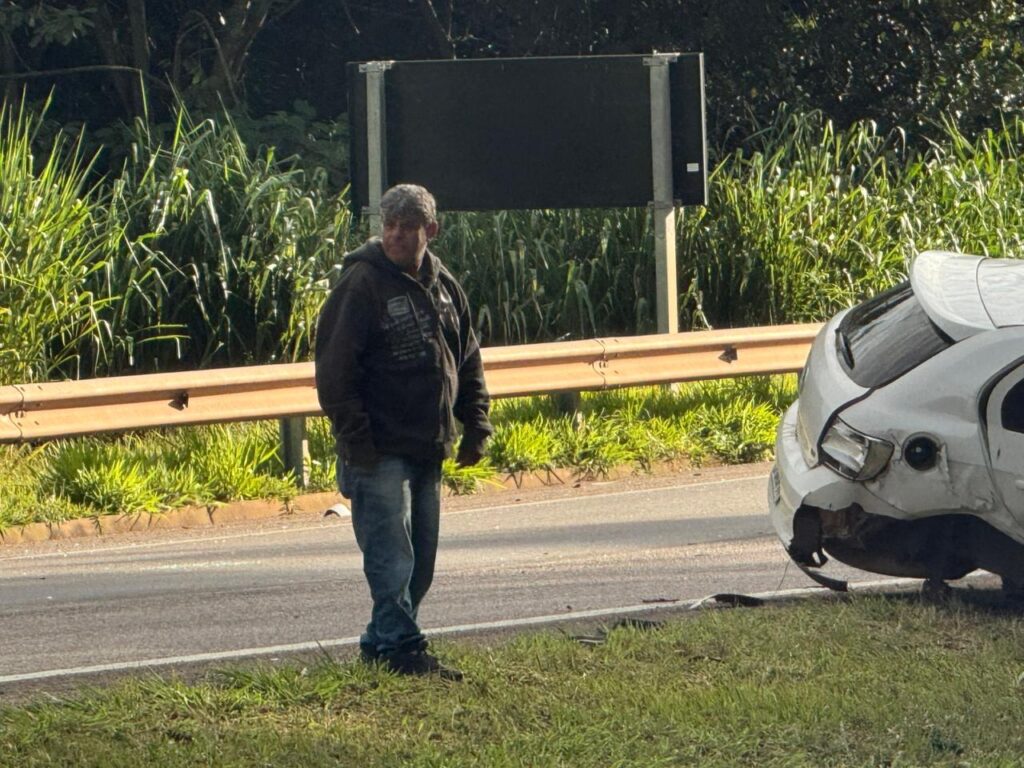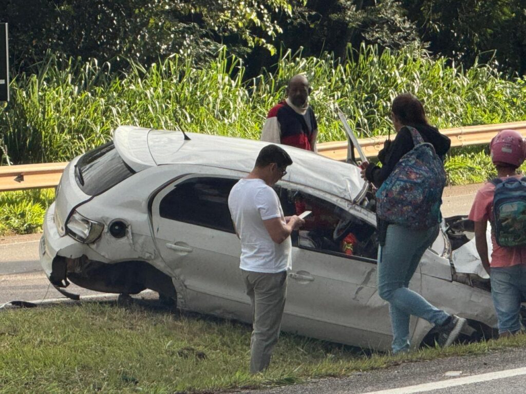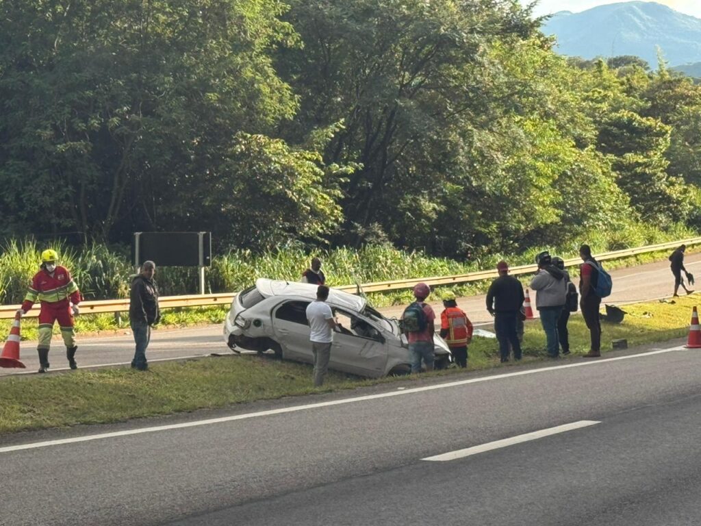De acordo com informações da Polícia Rodoviária, o motorista de um veículo VW Gol perdeu o controle da direção ao fazer uma curva. Na sequência, o carro colidiu contra a mureta de concreto que divide as pistas e acabou capotando, parando no canteiro central da rodovia.