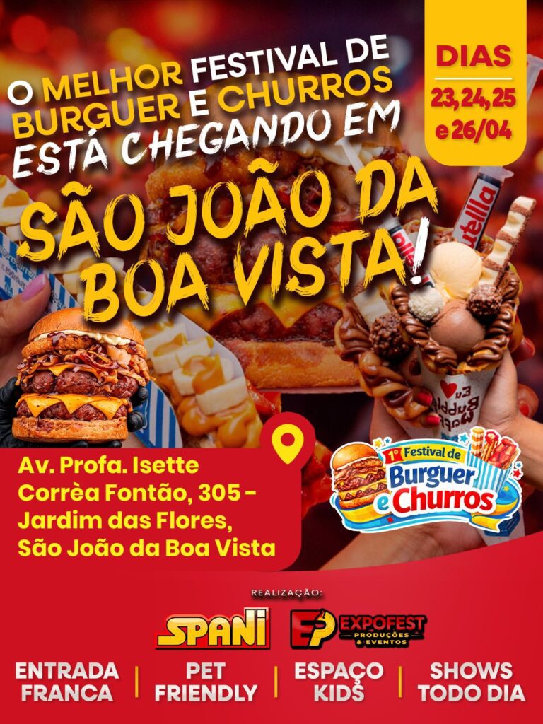 São João da Boa Vista se prepara para receber mais uma edição do Festival de Burger e Churros, evento gastronômico que promete atrair milhares de visitantes com uma combinação de sabores diferenciados, música ao vivo e estrutura pensada para toda a família. A programação acontece ao longo de quatro dias, reunindo opções que vão desde burgers artesanais até doces inovadores.