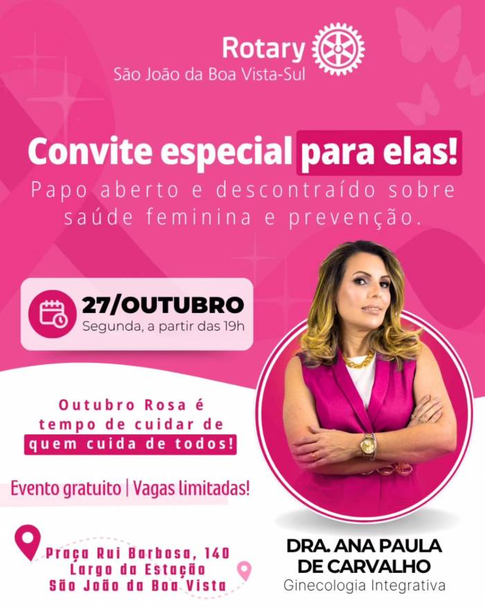 Na segunda-feira, 27 de outubro, às 19h, a ginecologista integrativa Dra. Ana Paula de Carvalho conduzirá um bate-papo gratuito e aberto a todas as mulheres, na sede do Rotary (Praça Rui Barbosa, 140 – Largo da Estação). O encontro integra as ações de conscientização do Outubro Rosa e tem como objetivo reforçar a importância da prevenção, diagnóstico precoce e cuidados com a saúde física e emocional das mulheres.