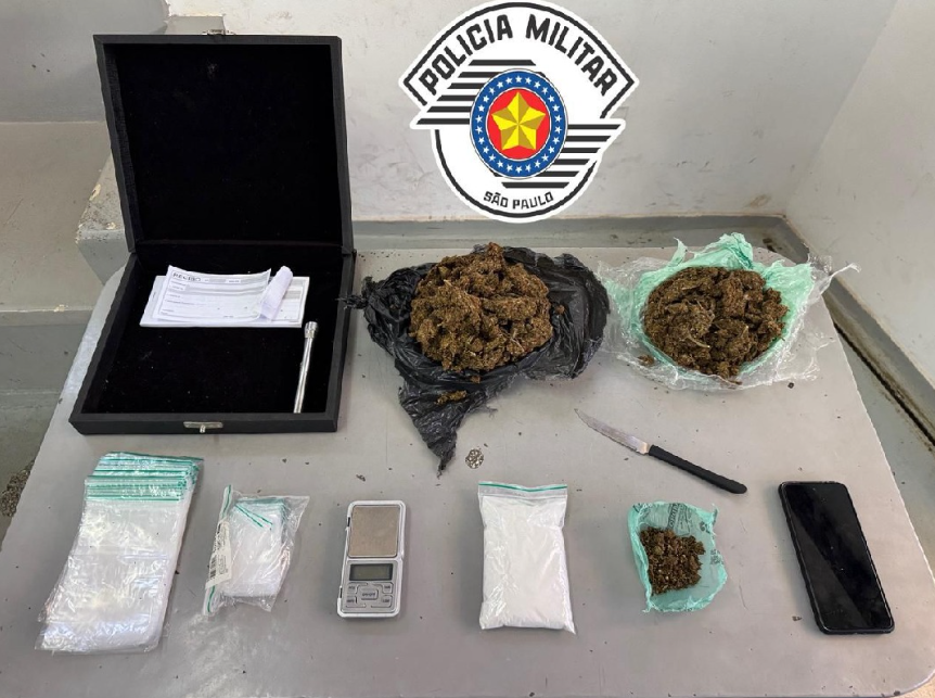 Dentro de uma mochila, os policiais localizaram duas porções grandes e uma menor de maconha, totalizando aproximadamente 500 gramas, além de 171 gramas de cocaína, uma faca com resquícios da droga, uma balança de precisão e diversas embalagens plásticas utilizadas para o fracionamento e comercialização dos entorpecentes.