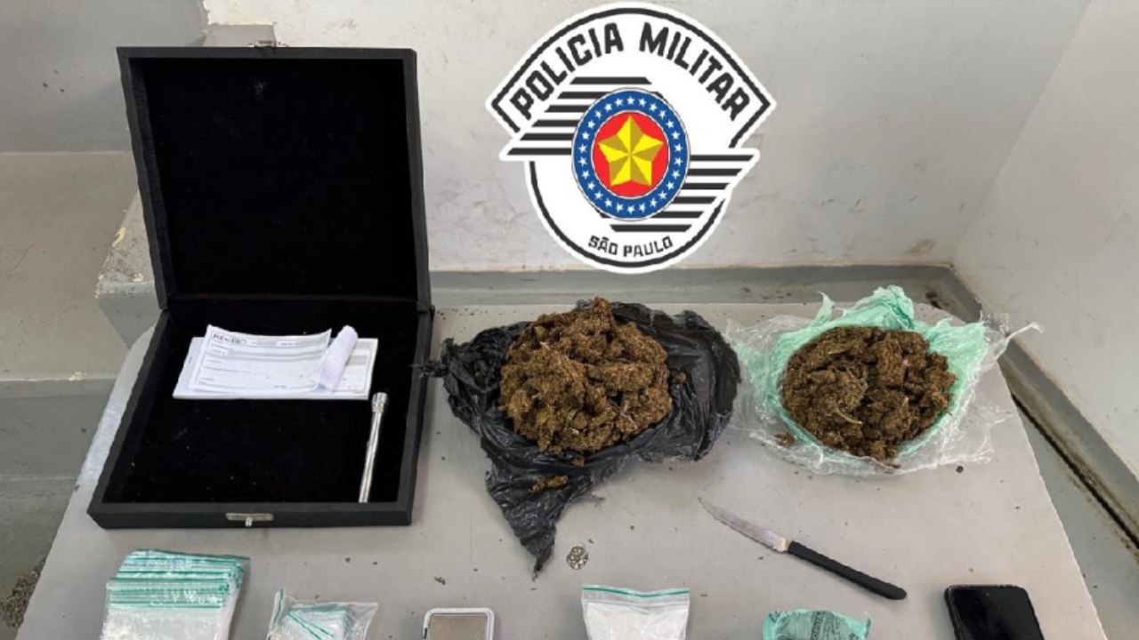 Dentro de uma mochila, os policiais localizaram duas porções grandes e uma menor de maconha, totalizando aproximadamente 500 gramas, além de 171 gramas de cocaína, uma faca com resquícios da droga, uma balança de precisão e diversas embalagens plásticas utilizadas para o fracionamento e comercialização dos entorpecentes.