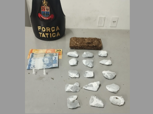 Durante a busca pessoal, nada de ilícito foi encontrado, porém o suspeito confessou possuir drogas em seu apartamento. Com autorização, os policiais entraram no imóvel e localizaram uma porção de maconha a granel, 15 porções embaladas separadamente, dois eppendorfs de cocaína e R$ 24,00 em dinheiro.
