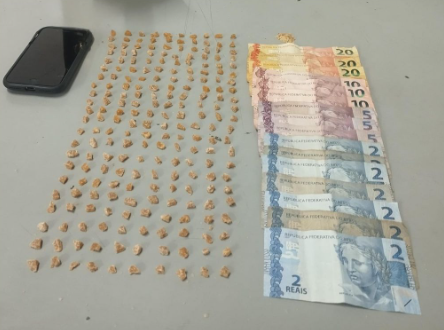 Durante a busca pessoal, os policiais localizaram 220 pedras de crack, além de dinheiro em espécie e um aparelho celular. Os materiais apreendidos são compatíveis com a prática do tráfico de drogas, o que motivou a prisão em flagrante.