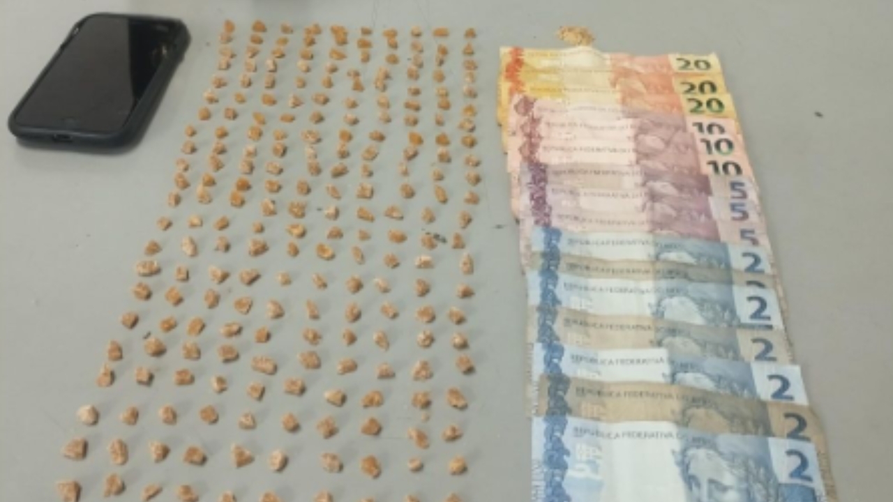 Durante a busca pessoal, os policiais localizaram 220 pedras de crack, além de dinheiro em espécie e um aparelho celular. Os materiais apreendidos são compatíveis com a prática do tráfico de drogas, o que motivou a prisão em flagrante.