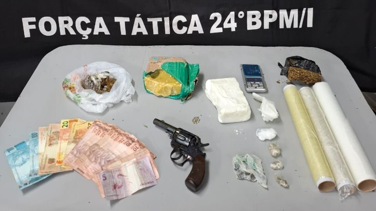 A primeira vistoria ocorreu na residência de L.H.S.L., na Rua Luís Vaz de Camões. A mãe do jovem acompanhou toda a busca. No quarto dele, os policiais localizaram porções de crack, cocaína e maconha, além de dinheiro em espécie. Em um cômodo separado, foi encontrado um revólver calibre .38 sem numeração e sem munições.