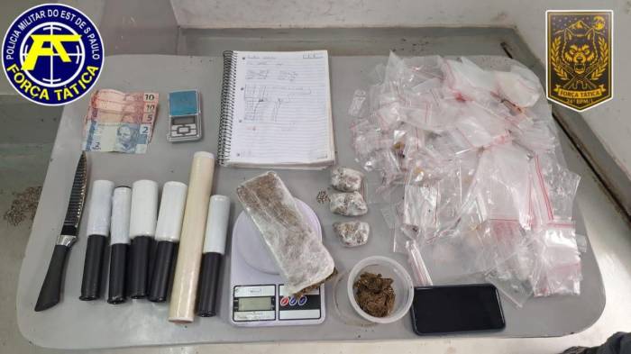 Com apoio da Força Tática, as equipes se deslocaram até o endereço indicado, localizado na Rua Amadeu Budri. No quarto do suspeito, os policiais encontraram um tijolo de maconha, uma porção da droga a granel, duas balanças de precisão, seis rolos de plástico filme, centenas de embalagens do tipo ziplock, uma faca com resquícios de maconha e um caderno contendo anotações detalhadas sobre vendas e recebimentos.