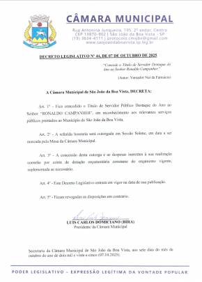 A Câmara Municipal de São João da Boa Vista aprovou, em 7 de outubro, o Decreto Legislativo nº 44/2025, que concede a honraria de Servidor Público Destaque do Ano a Ronaldo Campanher, em reconhecimento aos relevantes serviços prestados à comunidade sanjoanense. A homenagem é de autoria do vereador Nei da Farmácia e integra o calendário oficial de homenagens do Legislativo municipal.