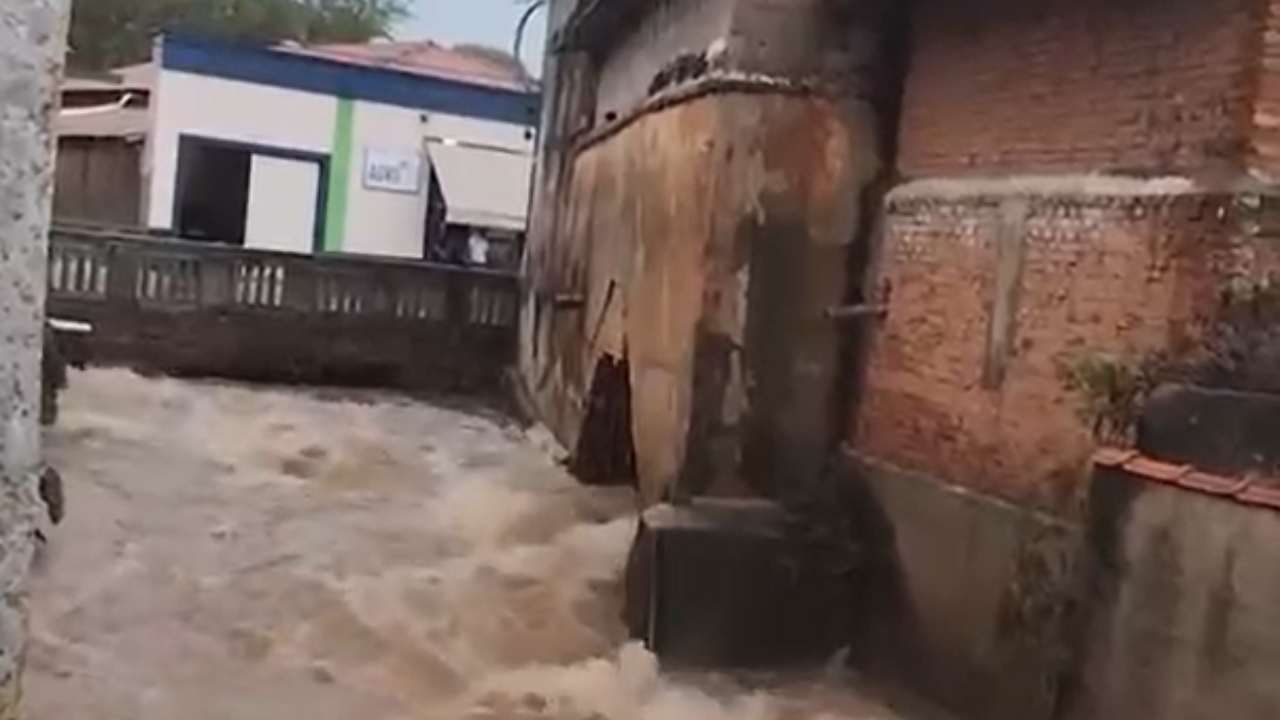Um morador da área teme que uma casa à beira do rio desabe devido à força da enxurrada, o que poderia bloquear o fluxo de saída da água, agravando ainda mais o risco de alagamentos.